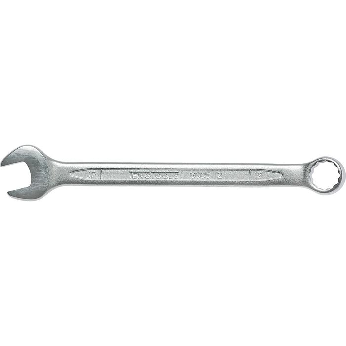 TengTools Combination Spanner 600512 - 12mm • Manufactured and designed in accordance with DIN3113A fromhigh grade Chrome Vanadium Steel. • Same dimensions at both ends. • The 12 point ring end is set at a 15° angle. • Hip grip ring ends to drive on the flat rather than thecorner to help avoid damage to fastenings and to enable use on previously damaged fastenings. • Polished heads. Satin finish.