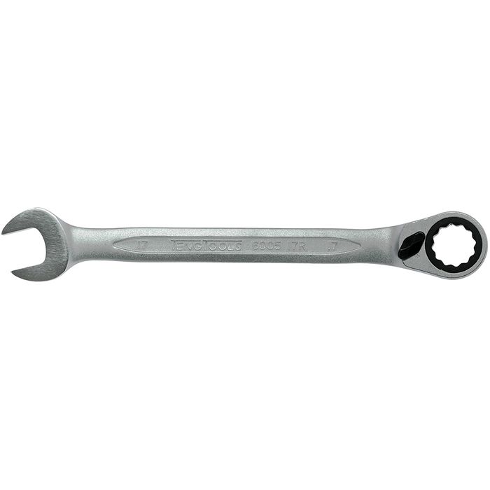 TengTools Ratcheting Combination Spanner • Reversible ratchets with 15 degree offset 12 point heads.• Flip reverse action for one handed direction change.• 72 teeth providing a 5 degree increment for a smooth action.• Manufactured and designed in accordance with DIN3113Afrom high grade Chrome Vanadium Steel.• Same size at both ends.• Polished heads. Satin finish.