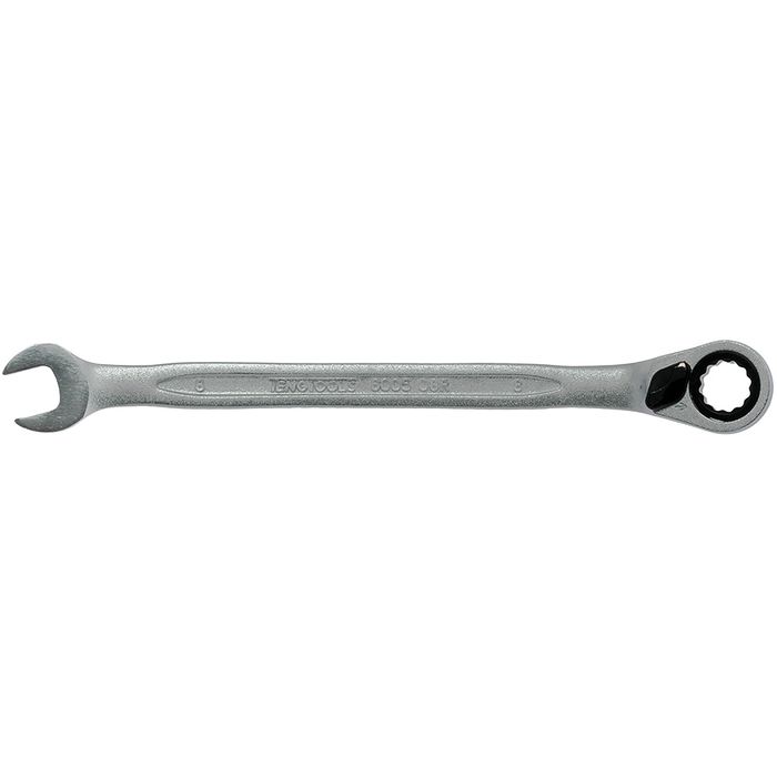TengTools Ratcheting Combination Spanner • Reversible ratchets with 15 degree offset 12 point heads.• Flip reverse action for one handed direction change.• 72 teeth providing a 5 degree increment for a smooth action.• Manufactured and designed in accordance with DIN3113Afrom high grade Chrome Vanadium Steel.• Same size at both ends.• Polished heads. Satin finish.