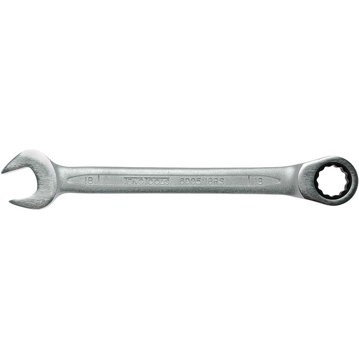 600518RS - Ratcheting Combination Spanner Size: 18mm • Straight Flat Type• 72 teeth with 12 point ratcheting ring end.• Same size at both ends.• DIN899.