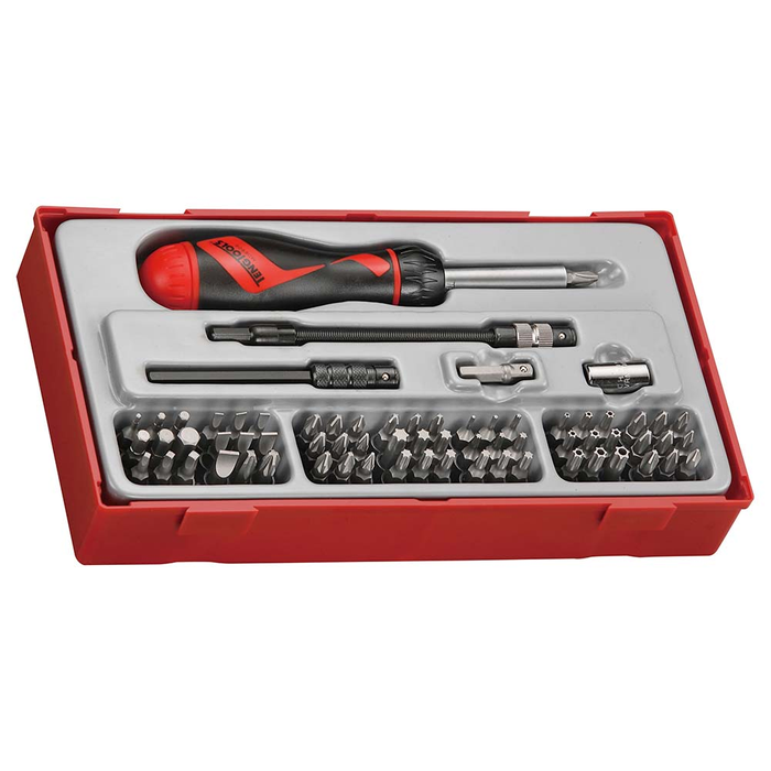 TC-Tray Modular System - Bits TTMD74 - 74pc Bits Screwdriver Set TC-Tray™ Modular System - GET ORGANISED WITH TENG! Tray Size: 265 x 142 x 50mm Tray Weight: 0.7kg • Consists of a ratcheting bit driver, 6" flexible extension, 4" extension bar, external square 1/4"Mx1/4" hexagonal external adaptor, internal square 1/4F"x1/4F" hexagonal internal adaptor and 69 bits. • Supplied in a plastic TC tray with removable lid. • Fits in Teng Tools tool boxes and roller cabinets. Bits for slotted heads: 0.6x3.5, 0.6x4.5, 0.8x4.0, 0.8x5.5, 1.0x5.5, 1.2x5.0, 1.2x6.5, 1.4x7.0, 1.6x8.0mm Bits for Phillips heads No: 1 (4), 2 (7), 3 (1) Bits for Pozidriv heads No: 1 (4), 2 (7), 3 (1) Bits for hex holes: 2, 3, 4, 5, 6, 8mm Bits for TX-heads No: 6, 7, 8, 9, 10, 15, 20 (3), 25 (x 3), 27, 30, 40 Bits for TPX-heads No: 10, 15, 20 (2), 25 (2), 27, 30, 40 Bits for square recessed heads No: 1, 2, 3 Bits for GR crosspoint tip No: 2 (3) Screw driver MD908