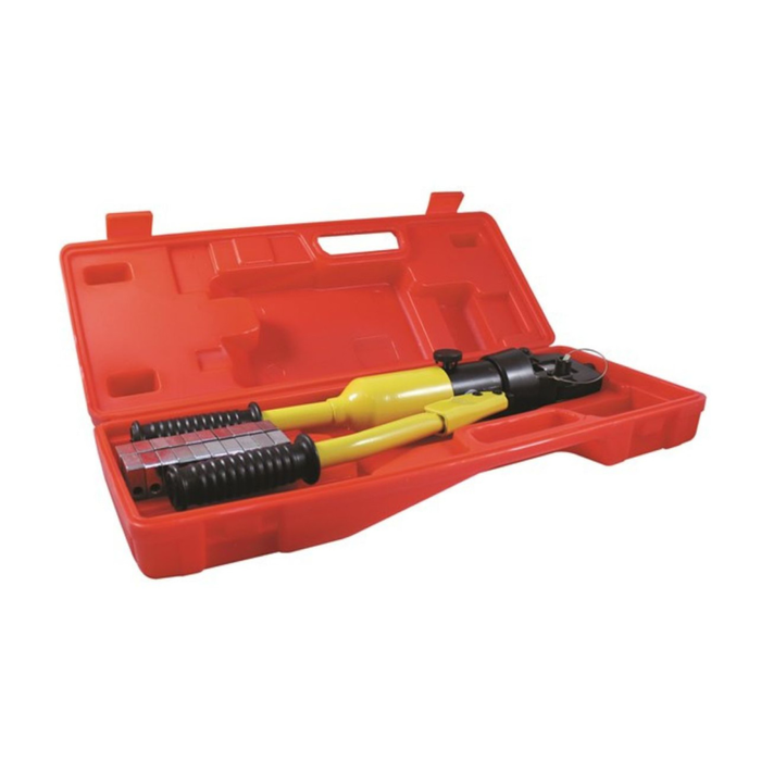 Comes with ten sets of interchangeable dies(16,25,35,50,70,95,120,150,185,240,300mm2) Suit lug size 16mm2-300mm2 Overall Length 500mm Up to 100KN crimping force Stroke- 22mm Hexagonal crimp indentation