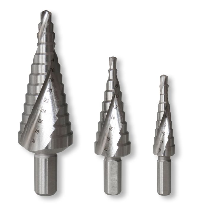 - HSS STEP DRILL BITS 3PC SET 12MM/20MM/30MM SPIRAL FLUTE STRAIGHT SHANK