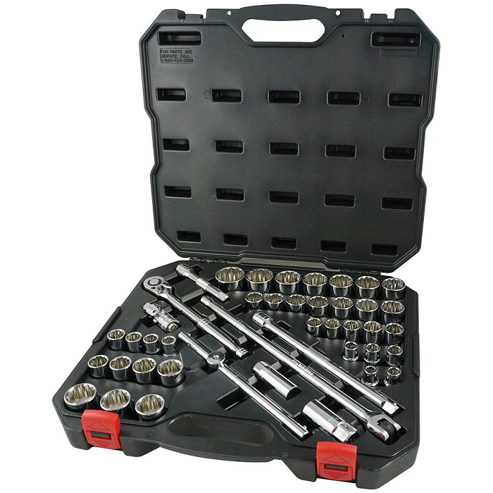 1/2” Dr (12pt Std) Sockets 10mm, 11mm, 12mm, 13mm, 14mm, 15mm, 16mm, 17mm, 18mm, 19mm, 20mm, 21mm, 22mm, 23mm, 24mm, 25mm, 26mm, 27mm, 28mm, 29mm, 30mm, 32mm, 34mm, 36mm, 1/2”, 9/16”, 5/8”, 11/16”, 3/4”, 13/16”, 7/8”, 15/16”, 1”, 1 1/16”, 1 1/8” 1/2? Dr Gear to Gear Ratchet (48T) 1/2” Dr x 5/8”, 13/16” Spark Plug Sockets 1/2” Dr x 125mm/5”, 255mm/10” Extensions 1/2” Dr 430mm/17” Power Bar 1/2” Dr 255mm/10” Sliding T Bar 1/2” Dr Universal Joint Packaged in a blow moulded case