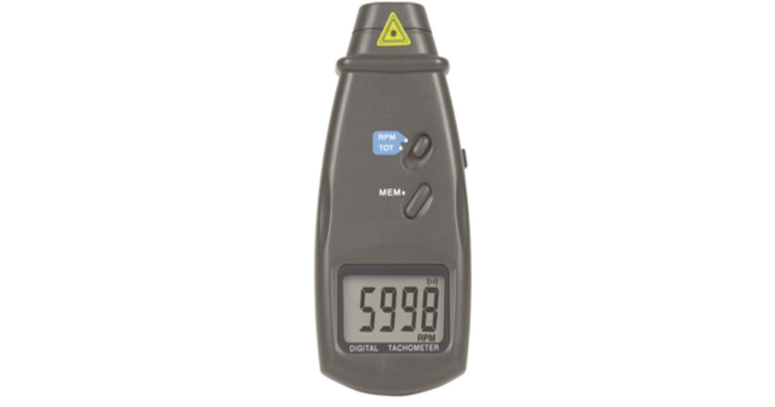 *5 Digit *99,999 RPM This easy-to-use hand held digital tachometer measures up to 99,999 RPM and features a large LCD display, laser pointer, low battery indicator, and memory recall for the last displayed value, minimum value, and maximum value. It can also be switched to measure either actual RPM or total revolutions. It also features a DC socket for mains power (5VDC at 50mA). Supplied with carry case and 600mm reflective tape marks, which can be cut to size. Features: • Display: 5 Digits, 16mm 0.7 LCD • Test range: 2.5 to 99,999 RPM • Resolution: 0.1RPM (2.5 - 999.9 RPM), 1RPM (over 1000PRM) • Sampling time: 0.5 sec (over 120RPM) • Range Select: Auto-Ranging • Detecting Distance: 50mm to 500mm • Time Base: Quartz Crystal • Operation Temp: 0 - 50°C